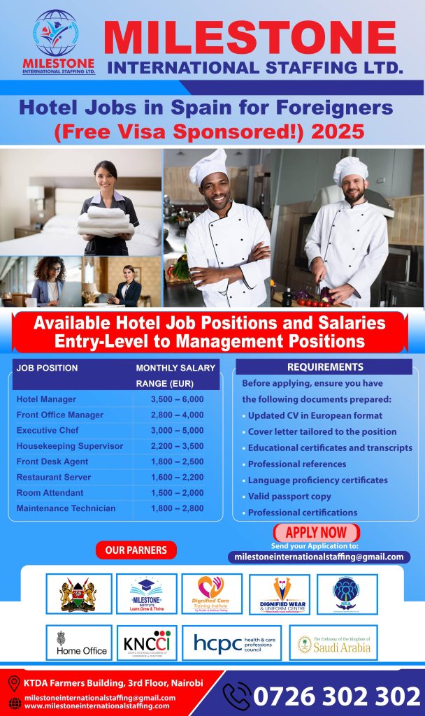 Milestone International Staffing Ltd is the leading Local and International Staffing and job recruitment Agency in Kenya. We have Hotel Jobs in Spain for Foreigners (Free Visa Sponsored!) 2025. More jobs on our Facebook Page: https://web.facebook.com/milestoneinternationalstaffingltd/ Website: https://www.milestoneinternationalstaffing.com/category/jobsinkenyatoday/